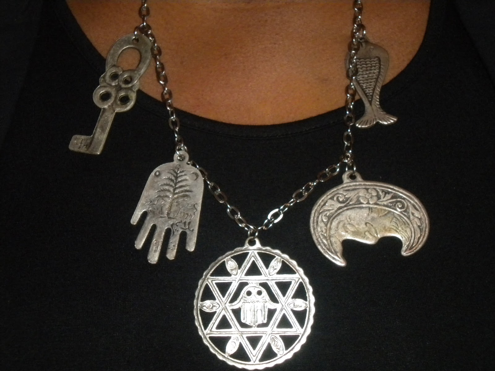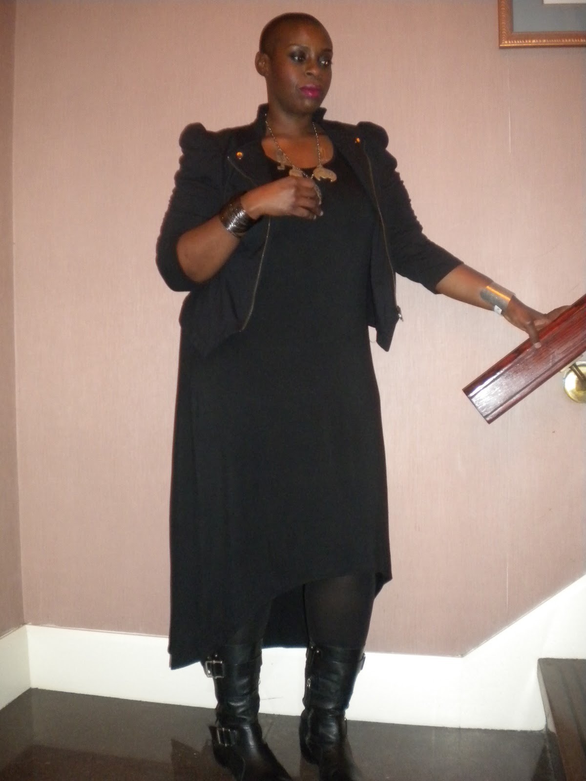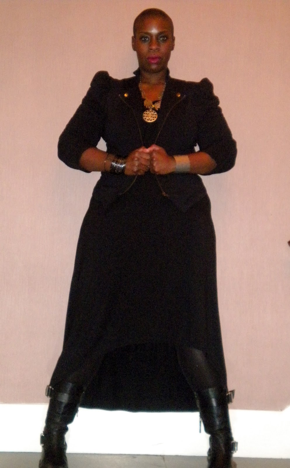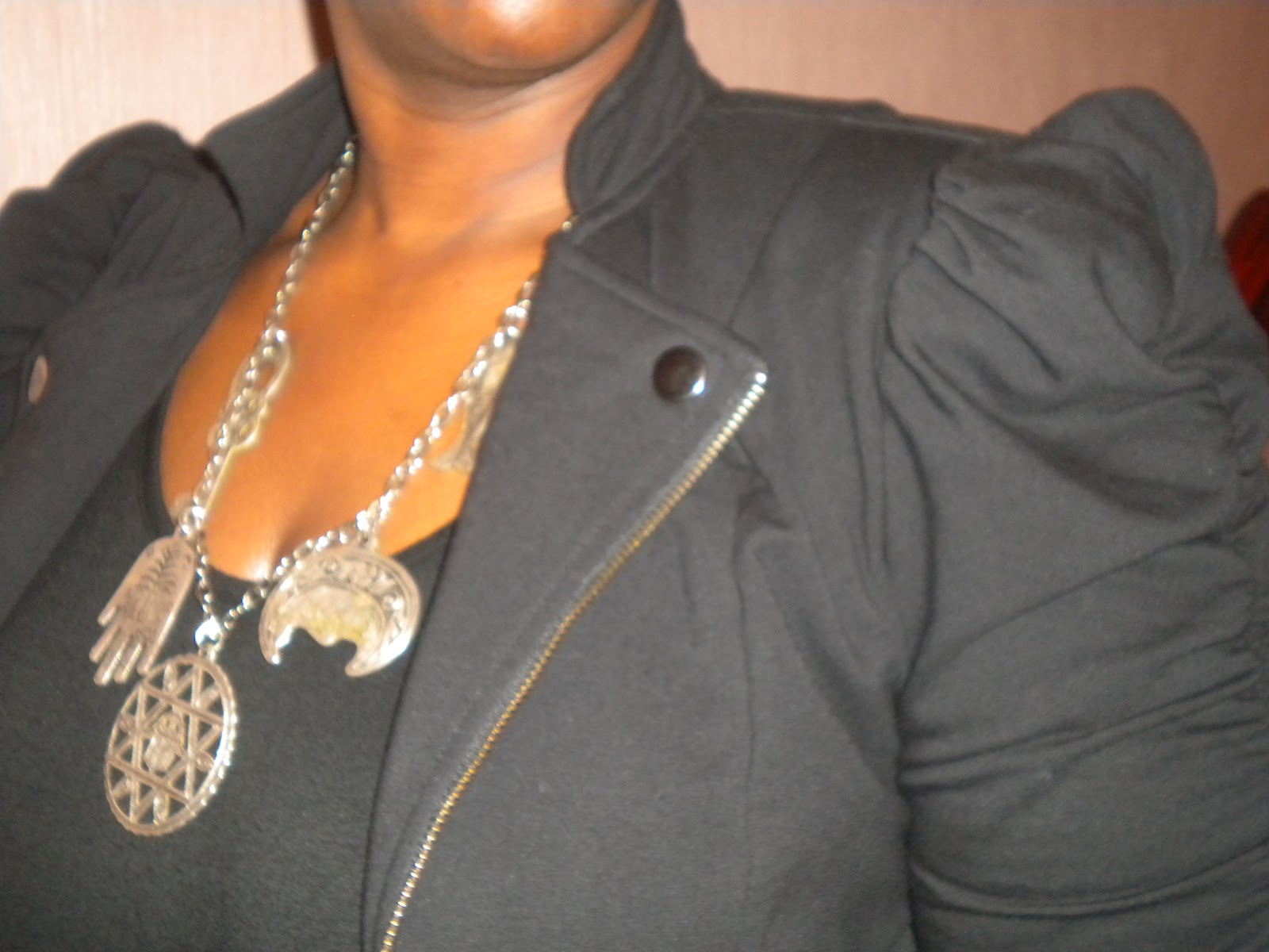 My dilemma was to find something that I could wear first to one of my best friend’s house for a small get-together, then still wear to the Al Sura event. So below are pics of what I wore. The jacket is one that I bought from Macy’s two years ago, from their I.N.C collection in a size Large. The jacket is a ponte knit, so it stretches well. The dress is also from Macy’s. I love the asymmetrical hemline of the dress and because it has short sleeves, I can take this into the spring/summer. It is a size 2X, but I wish I would have gotten a 1X because it is too big in certain places, but nothing that a belt can’t fix. The necklace is a thrift store find that I was honestly very scared to bring home. I feel in my heart that the charms/symbols are representative of something sinister, but I said a couple chants over it, and I’m at peace. It was too cute to leave and it was only $2.50! And my trusted boots- my Vera Wang Lavender boots I purchased from Nordstrom over 2 years ago. I have had them a while, but this year I am in love with these boots! I had originally planned to change into a high heeled knee boot when I left my friend’s house, but decided against it. I love my boots with this look…