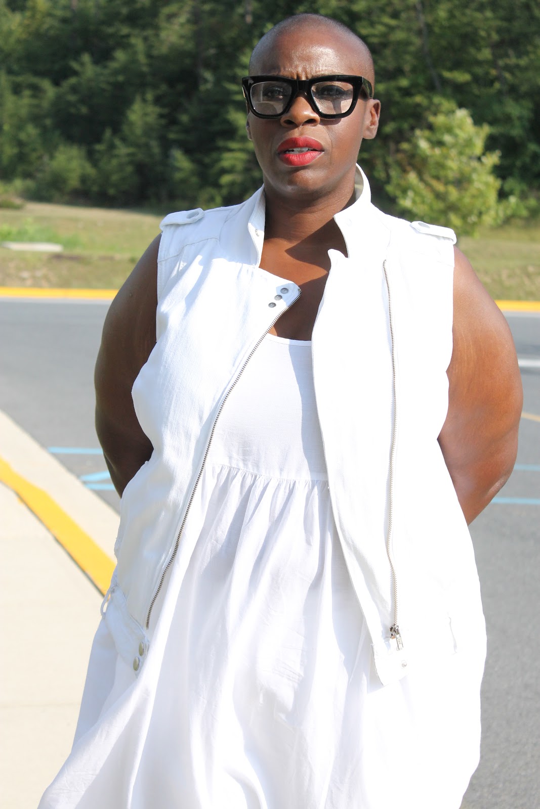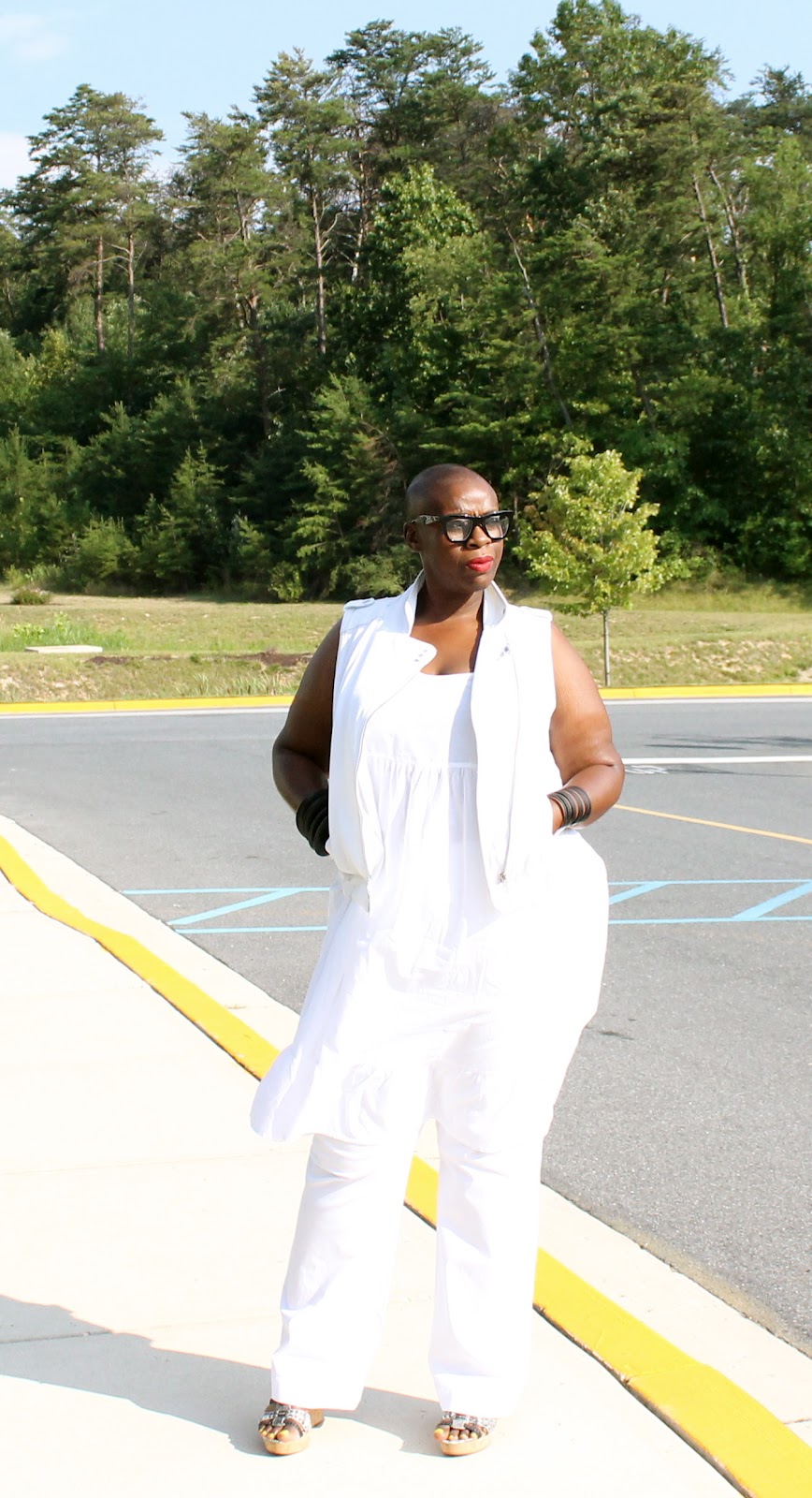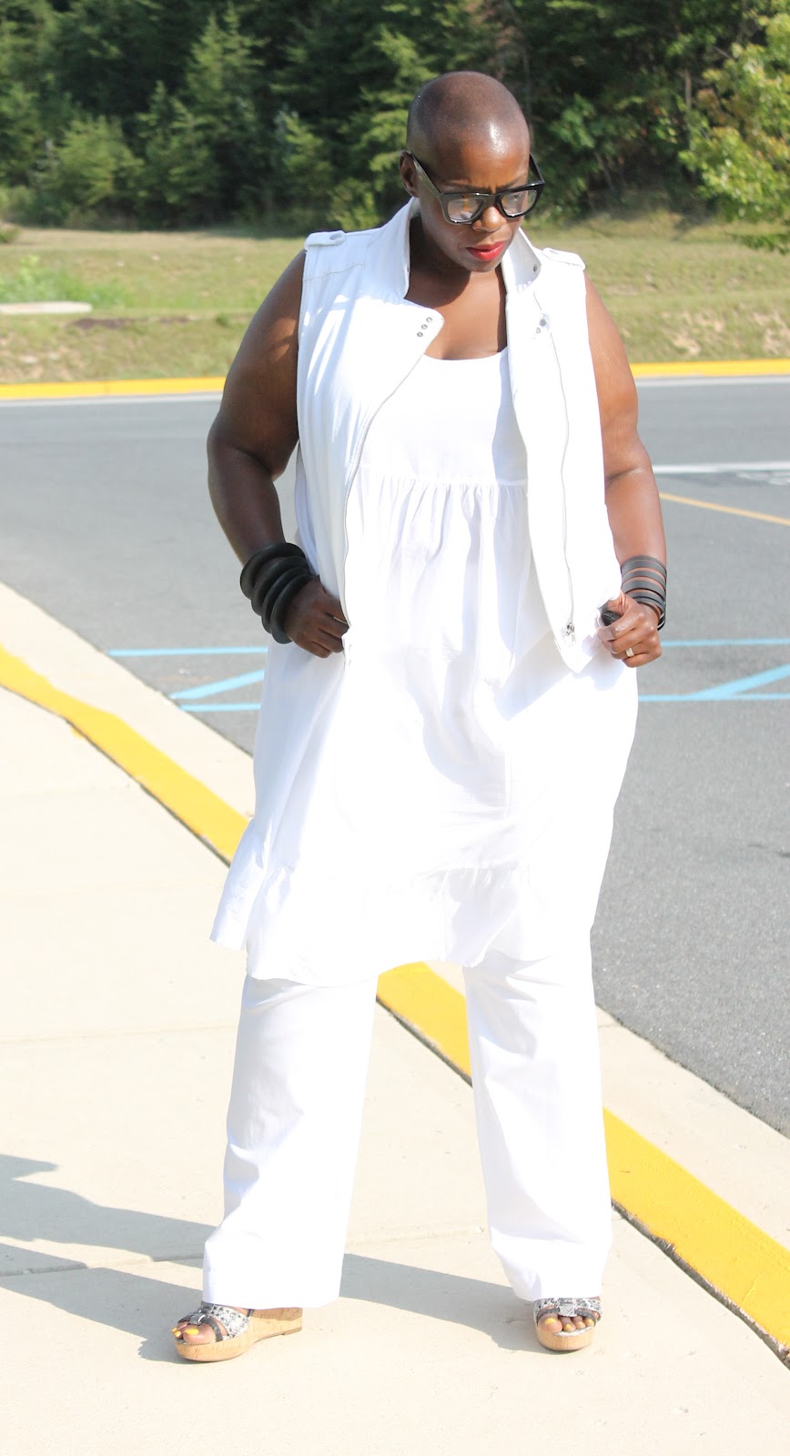 | White moto vest: DKNY @ Lane Bryant; White pants: Talbots; White dress: ASOS Curve (old); Snakeskin wedge sandals: Guess |