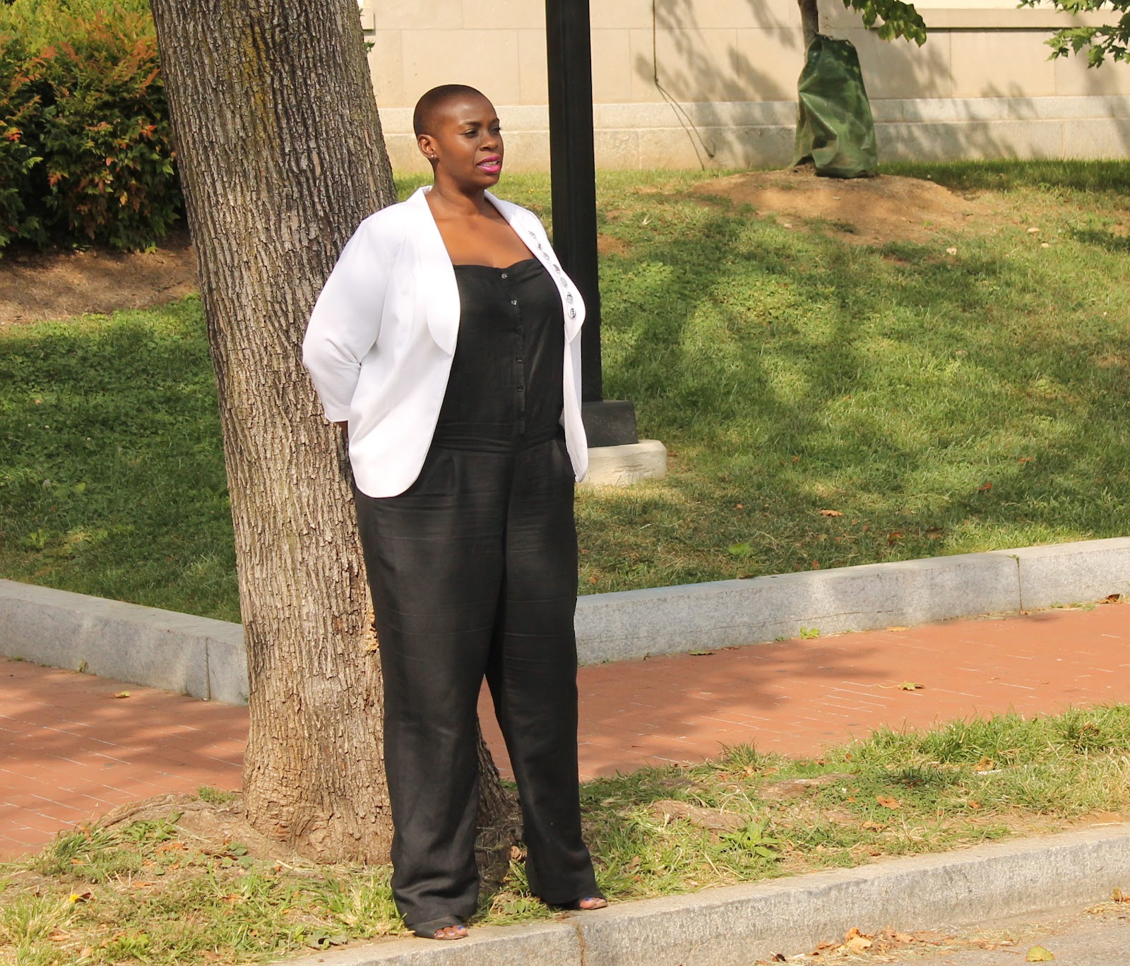 Black and white. The quintessential color combination. Timeless. If you follow me on Instagram (@girlsofplenty), you have seen this black jumpsuit many times. Usually thrown over a bodysuit or a leotard, this was a summer go-to for me. I purchased this from Ashley Stewart for $10! The absolutely best $10 I have spent this summer. It is light, comfortable, and black. As I attempt to shop my own closet for a while, I decided that this jumpsuit had a little more life in it, and could actually be dressed up. This white, shawl collar blazer from Eloquii ups the jumpsuit’s style quotient a bit and grows it up just a little.
