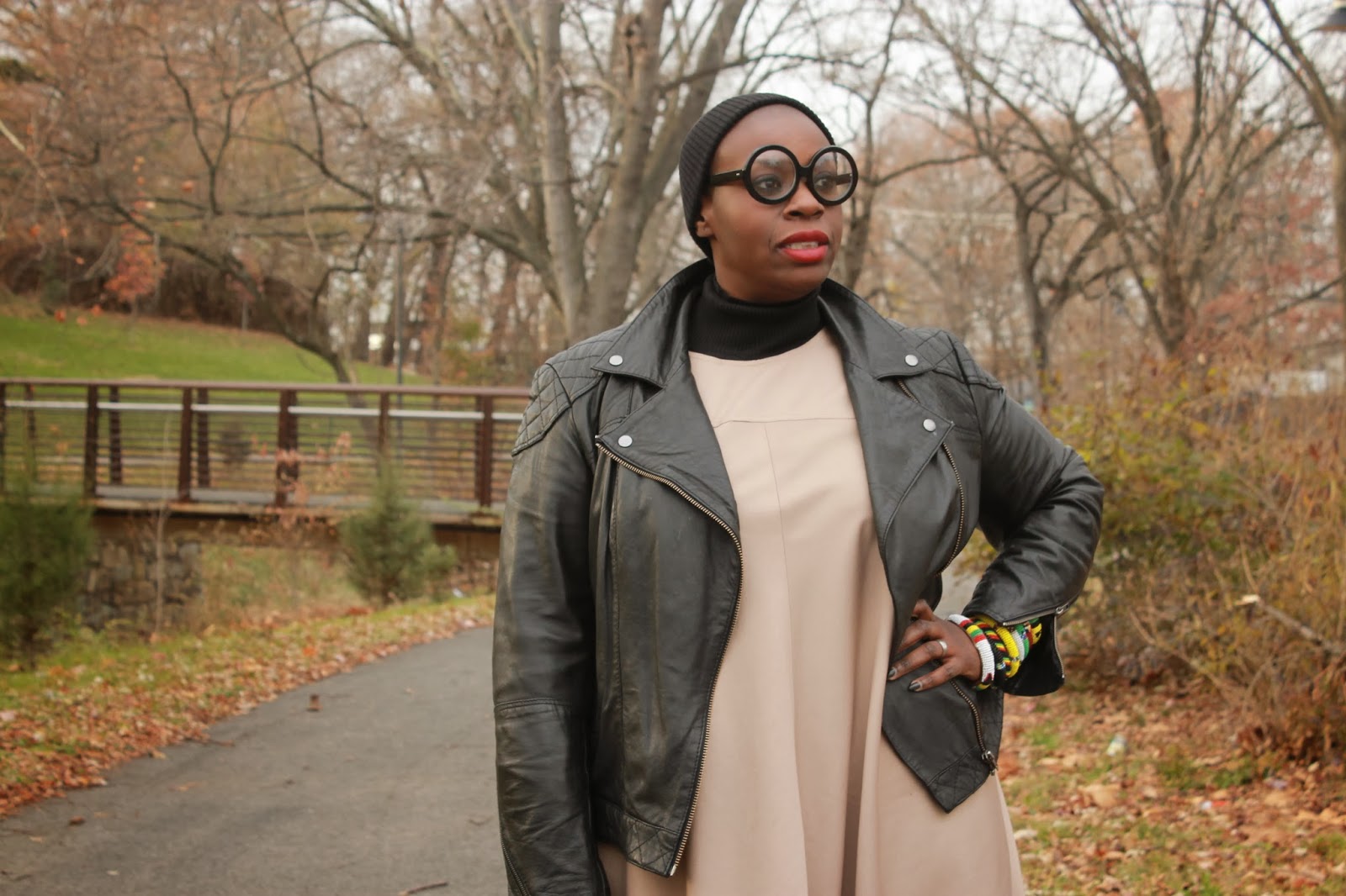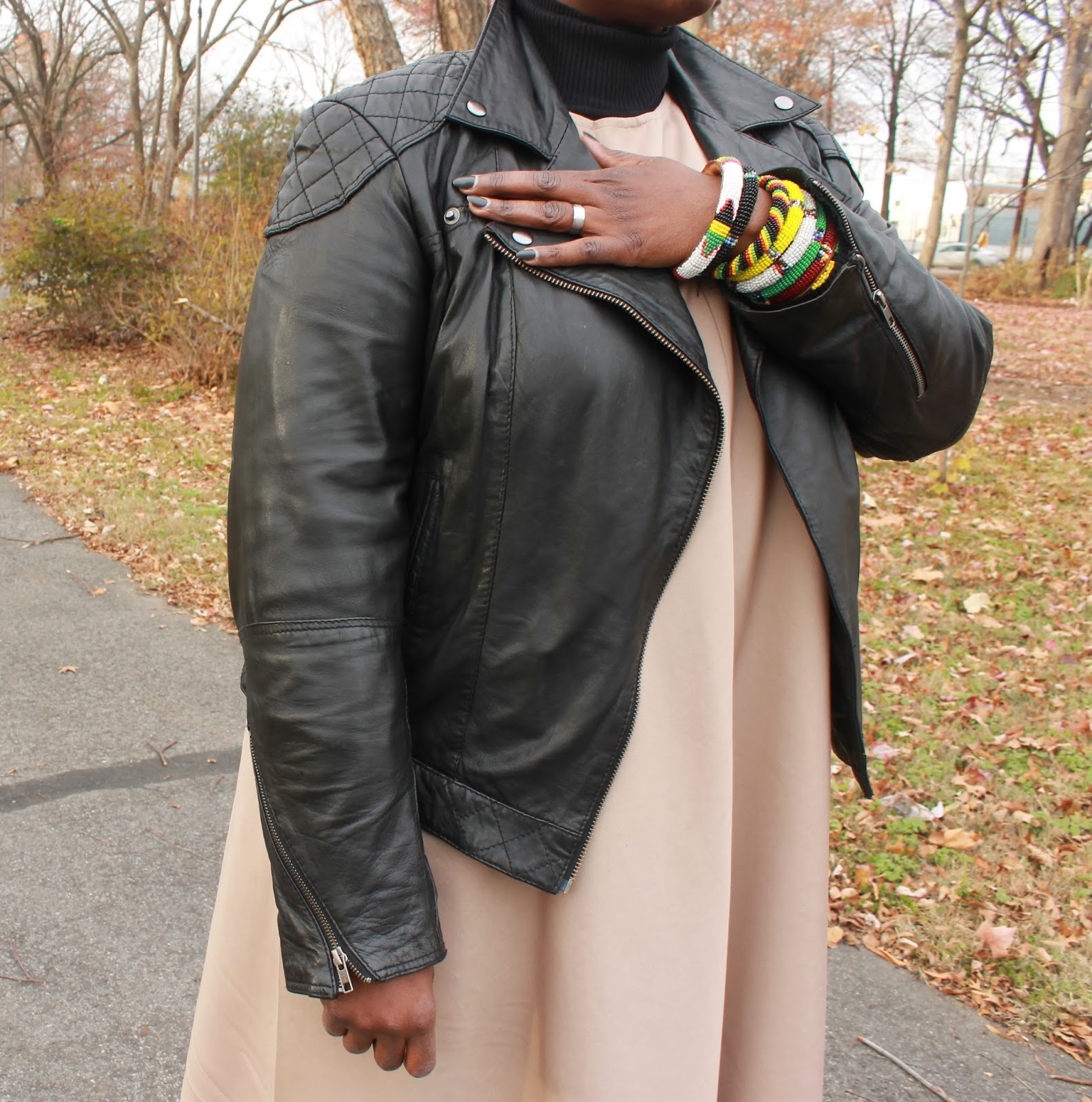 | Leather Motorcylce Jacket: Asos Curve, Dress: Thrifted, Turtleneck: Express |