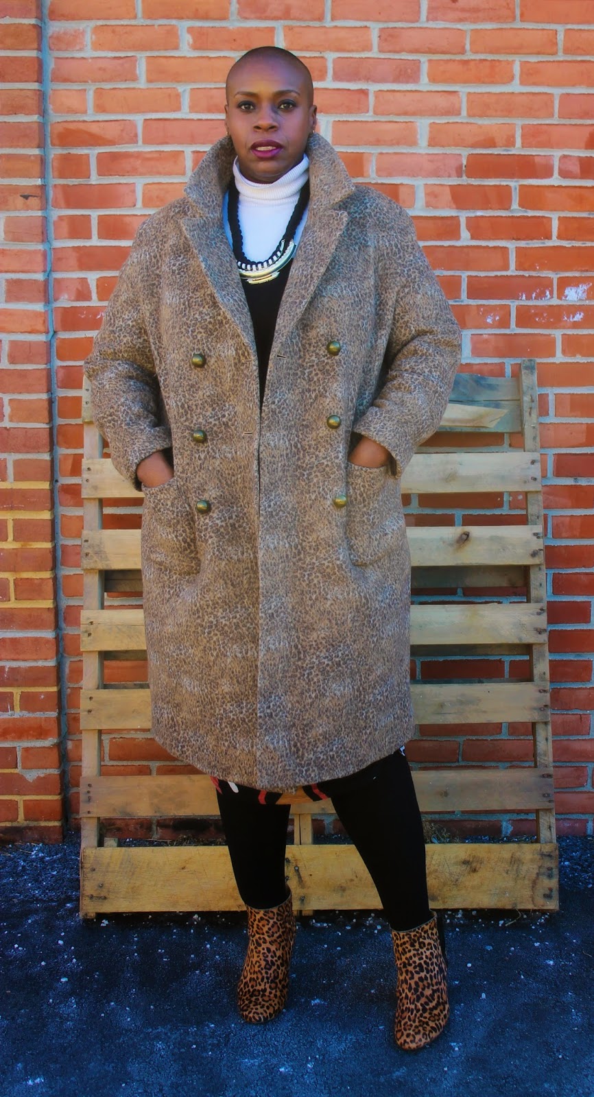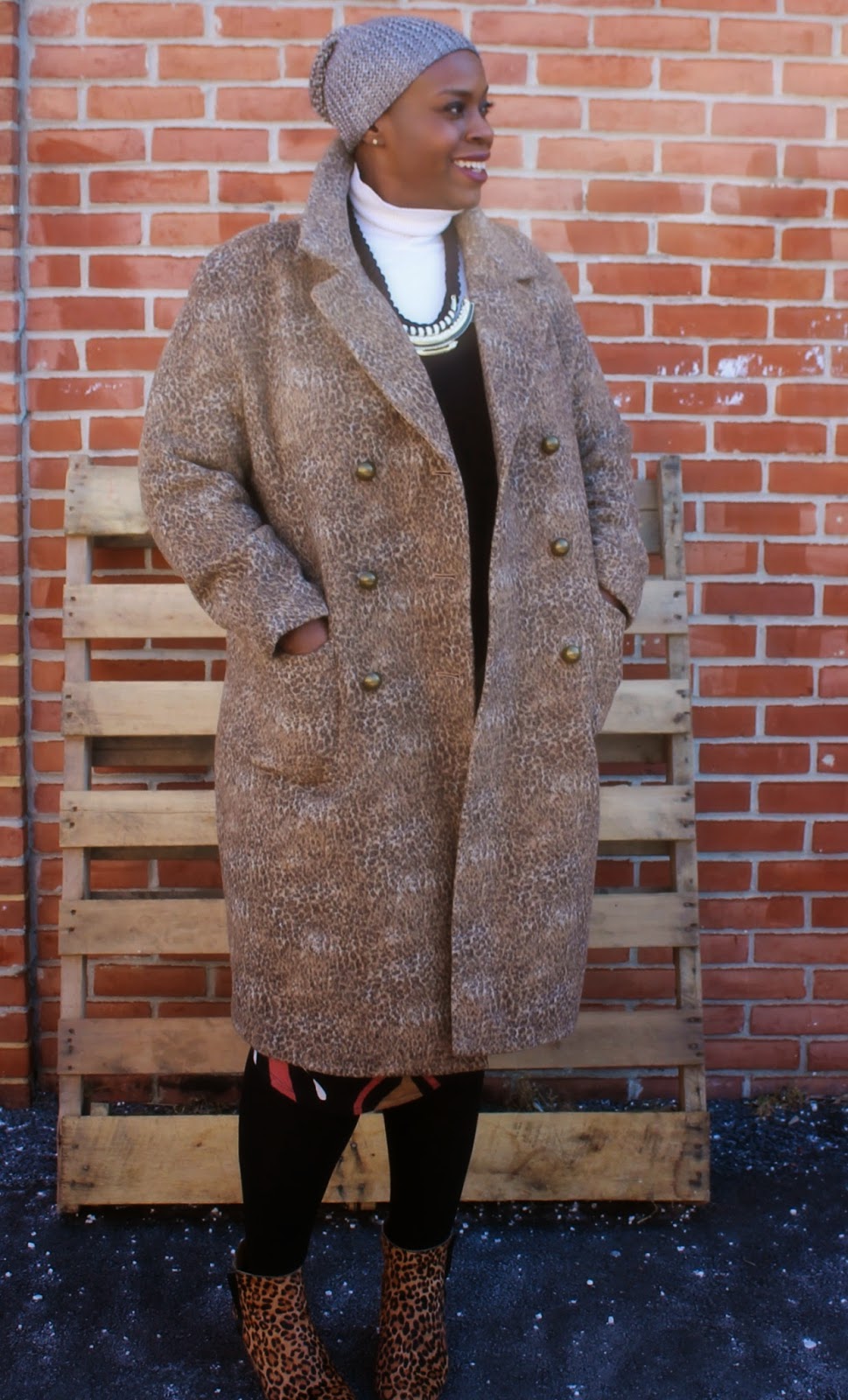 If you live in the US, you know that this “polar vortex” has made dressing a complete nightmare. On this day, the weather was 26 Degrees fahrenheit, a virtual summer in these parts. To pull myself out of the winter funk I have been experiencing, I tried to dress in my two favorite things; African mudcloth print and leopard. Both harken back to the Motherland, and both, in my mind, conjure up images of a copper sun and the warmth it emanates. To create a bit of subtlety in what could have easily been print craziness, I topped this mudcloth print jersey skirt, with a trusty Black/Cream color block turtle neck I have had in the closet for years. My trusty Black tights help to anchor this printapalooza, and my neutral makeup with dark berry lips also lend an air of classiness that is much needed in this ensemble. I pulled out one of the fave coats this year, and decided that you can never have too much leopard. “Never too much, never too much, never too much…” Sorry, I was channeling Luther Vandross as I looked at this leopard on leopard. But it can never be too much can it?